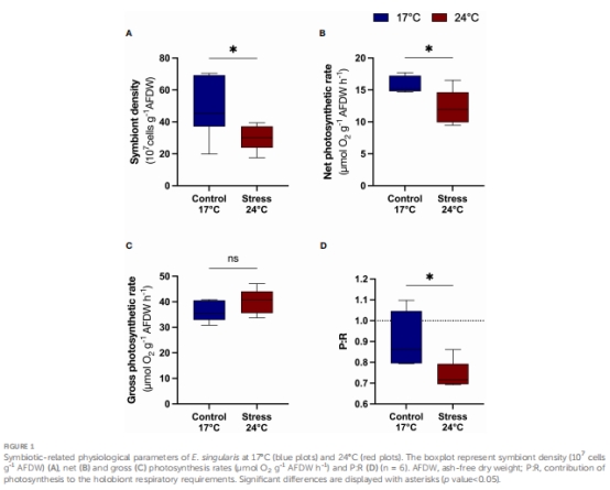 熱應激(24℃)導致珊瑚生理受損:共生型珊瑚共生藻密度下降40%(圖1A),呼吸速率顯著上升(圖2C),脂質儲備減少(非共生型,圖2A)。