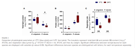熱應激(24℃)下兩種珊瑚呼吸速率顯著升高(E. singularis ↑47%,P. clavata ↑73%),證明代謝成本增加。此數據是評估能量赤字的核心依據。