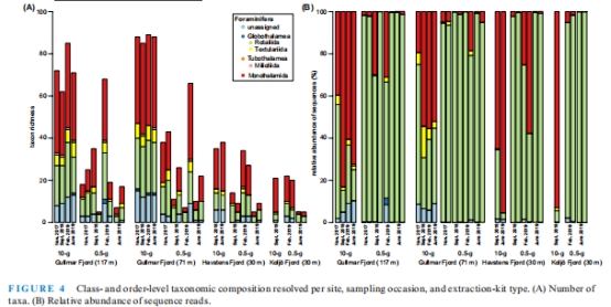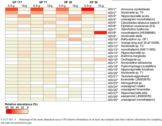 數(shù)據(jù):0.5g樣本中 Ammonia confertitesta(ASV1*)占比83%,而10g樣本以單室有孔蟲(chóng)(Monothalamids)為主(平均58%)。