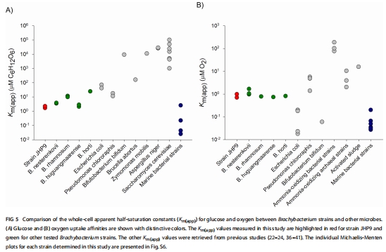 氧/葡萄糖親和力Km(app) 圖5 超高氧親和力(Km=0.73–1.22 μM)和葡萄糖親和力(Km=0.73–1.22 μM),適應低營養環境。