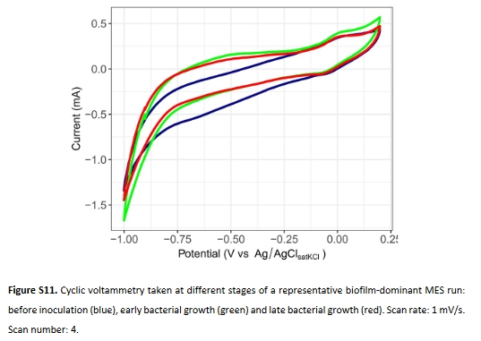 電流密度 恒電位儀(圖4A) 浮游表型電流密度(-0.45 mA cm?2)更高,關聯更高代謝活性。