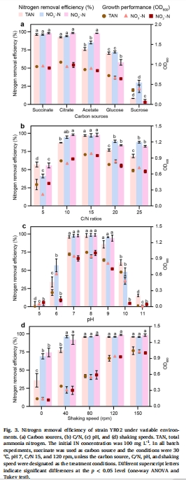 解析菌株YR02的氮代謝路徑及環境因子(碳源、C/N、pH、DO)對其效能的影響。