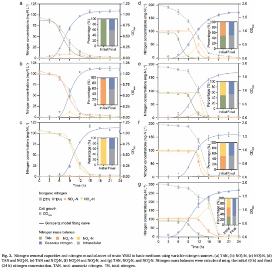 性能測試:在7種氮源組合下評估IN去除效率(圖2),氮平衡分析顯示氣態氮占比41.6–47.4%。