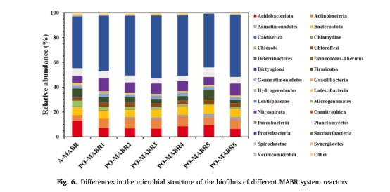 數據:PO-MABR中好氧菌(變形菌門51%)和硝化菌(硝化螺旋菌門10%)豐度更高