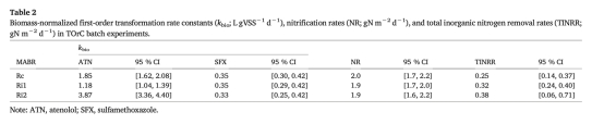 TOrCs去除選擇性:高頻間歇曝氣(Ri2)顯著提升阿替洛爾去除率(kbio提高109%),磺胺甲惡唑不受影響,異養菌主導降解。