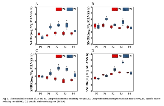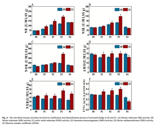 生物活性評估:檢測比代謝速率(SOUR/SAOR等)(圖3)、氮代謝酶活性(NR/AMO等)(圖4)及電子傳遞活性(ETSA)(圖4F)
