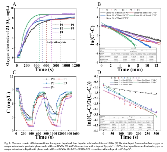 傳質(zhì)系數(shù)精準(zhǔn)計算:通過ln(C*-C)~t線性擬合(圖2B)和擴散模型分別計算KLa和Dapp,避免傳統(tǒng)方法誤差