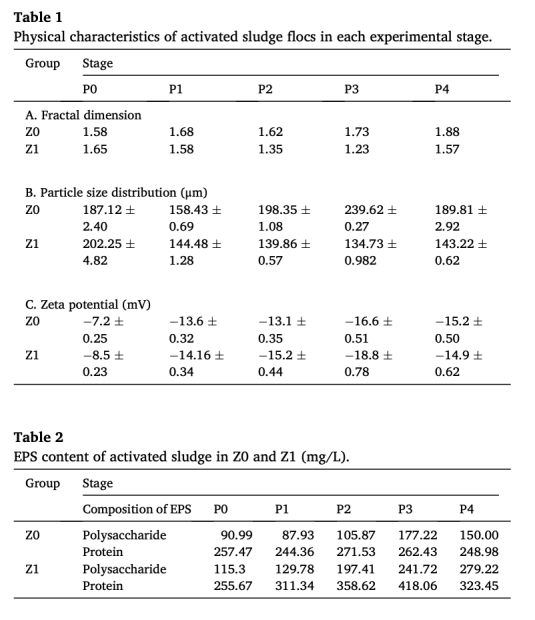 污泥特性分析:測定絮體分形維數(shù)(表1)、粒徑分布(表1)、Zeta電位(表1)及胞外聚合物(EPS)組成(表2)