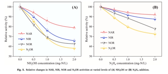 數據:NH?OH(2.0 mg-N/L)使NIR和N?OR活性降低41.9±2.8%;N?H?(2.0 mg-N/L)特異性抑制N?OR活性(下降27.4±2.4%)。