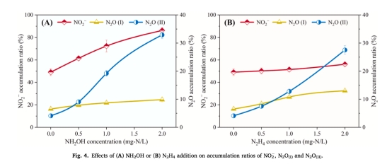 數據:NH?OH引發N?O在亞硝酸鹽還原階段峰值達6.8 mg-N/L(RN?O(II)=32.9±1.3%);N?H?則在兩階段均促進N?O積累(RN?O(I)=13.0±0.3%, RN?O(II)=27.5±1.5%)。