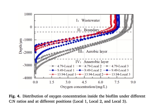 數據:氧濃度分四區(廢水相→邊界層→好氧生物膜→厭氧生物膜),C:N=4.79時生物膜最厚(2422±411 μm)。
