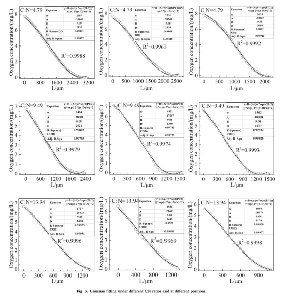 微觀尺度:建立生物膜好氧層厚度(LF)與氧濃度的高斯模型(C(L)=C?+A·e?2??????2/?2),擬合度R2≥0.9963。