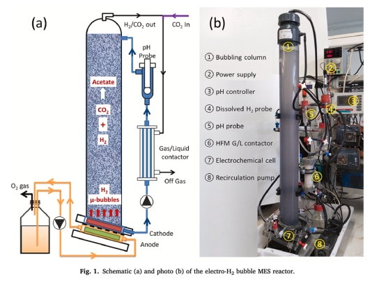 新型反應(yīng)器通過電解H?微氣泡、氣泡柱延滯及HFM氣體回收,實現(xiàn)非生物膜驅(qū)動MES的高性能(乙酸產(chǎn)率1.15 g/L/d,濃度34.5 g/L)。