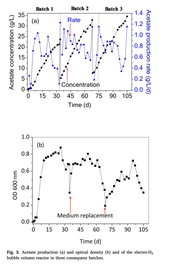 乙酸產(chǎn)率與濃度(圖3a):第三批次達峰值1.15 g/L/d和34.5 g/L,為傳統(tǒng)MES反應(yīng)器2–3倍(對比表1數(shù)據(jù))。