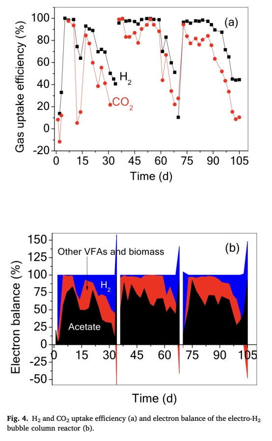 氣體利用效率(圖4a):H?平均利用率82%,穩(wěn)態(tài)近100%,表明HFM接觸器有效回收氣體。