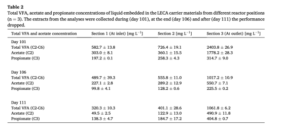 數(shù)據(jù):階段III第101天頂部VFA達(dá)2403.8 mg L?1(乙酸占74.9%),pH降至6.3;底部VFA僅582.7 mg L?1。