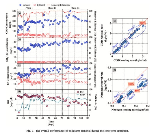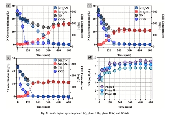 典型周期實(shí)驗(yàn)數(shù)據(jù):包括污染物濃度隨時(shí)間變化(如NH4-N、TN)和DO動(dòng)態(tài)。來源:圖2a-c和圖2d。研究意義:揭示系統(tǒng)在短時(shí)間內(nèi)的去除動(dòng)力學(xué)(如TN在180分鐘內(nèi)快速下降),證明SND過程的發(fā)生(NO3-N生成量低于NH4-N消耗量),并確認(rèn)旋轉(zhuǎn)設(shè)計(jì)實(shí)現(xiàn)穩(wěn)定DO環(huán)境(6-9 mg/L),支持無需外部曝氣的運(yùn)行模式。