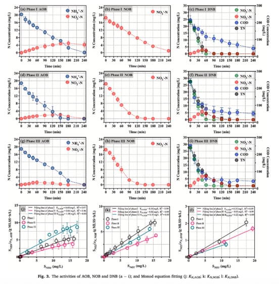 微生物動(dòng)力學(xué)數(shù)據(jù):包括氨氧化速率(AOR)、亞硝酸鹽氧化速率(NOR)、反硝化速率(DNR)及Monod動(dòng)力學(xué)參數(shù)(如KN,AOB)。來源:圖3和表2。研究意義:量化功能菌活性(如DNB速率高達(dá)42.73 mg/L/h),解釋生物膜內(nèi)擴(kuò)散阻力變化(KN,AOB上升),并關(guān)聯(lián)系統(tǒng)脫氮效率提升(如μmaxNO3增加至15.02 mg/g MLSS/h),為優(yōu)化生物膜載體設(shè)計(jì)提供依據(jù)。