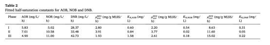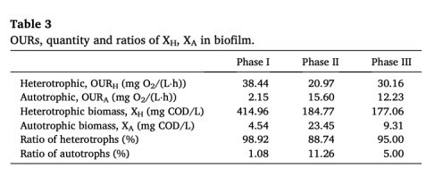活性生物量數(shù)據(jù):包括異養(yǎng)生物量(XH)和自養(yǎng)生物量(XA)比例及氧攝取率(OUR)。來源:表3。研究意義:量化生物膜中功能菌群分布(如XA占比最高11.26%),說明高異養(yǎng)生物主導(dǎo)碳代謝,而自養(yǎng)生物增長(zhǎng)支撐硝化性能,反映系統(tǒng)對(duì)負(fù)荷變化的適應(yīng)性。