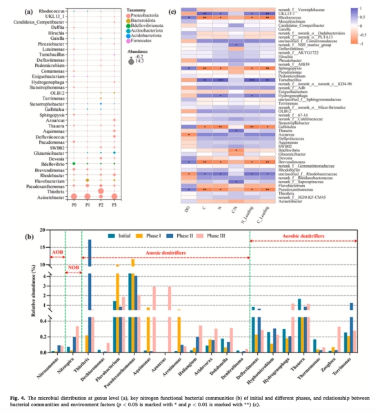 微生物群落數(shù)據(jù):包括優(yōu)勢(shì)菌門(如Proteobacteria)及關(guān)鍵氮功能菌(如Thiothrix、Hydrogenophaga)豐度。來源:圖4a-b。研究意義:揭示SND的微生物機(jī)制(如缺氧反硝化菌富集至23.48%),并關(guān)聯(lián)環(huán)境因子(如DO與Pseudoxanthomonas正相關(guān)),解釋系統(tǒng)在好氧條件下實(shí)現(xiàn)反硝化的原因。