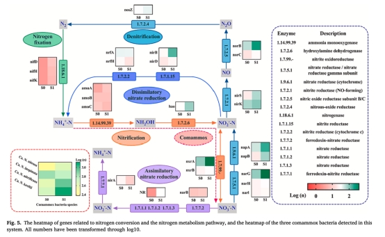 氮代謝途徑數(shù)據(jù):包括氮轉(zhuǎn)化基因(如amoABC、nirSK)和comammox菌(如Ca. N. nitrosa)豐度。來源:圖5。研究意義:通過宏基因組分析確認(rèn)反硝化為主導(dǎo)途徑(基因豐度高于初始兩倍),并發(fā)現(xiàn)comammox菌貢獻(xiàn)硝化效率,為SND的整合機(jī)制提供分子證據(jù)。