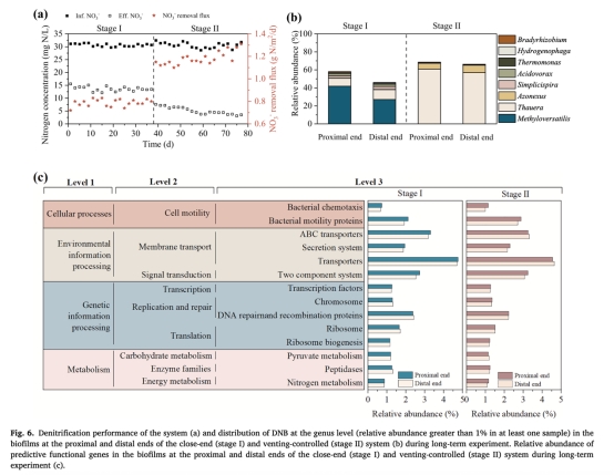 微生物群落與功能基因(圖6b-c, 表1):排氣后末端DNB豐度增至66.2%(封閉式46.0%),優勢菌從Methyloversatilis更替為Thauera,且氮代謝基因表達增強。