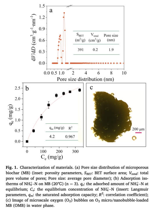材料制備:采用真空壓力擺動吸附法將O? MNBs負載于微孔生物炭(圖1c),通過孔隙特性(圖1a)和疏水性增強氣泡穩定性。
