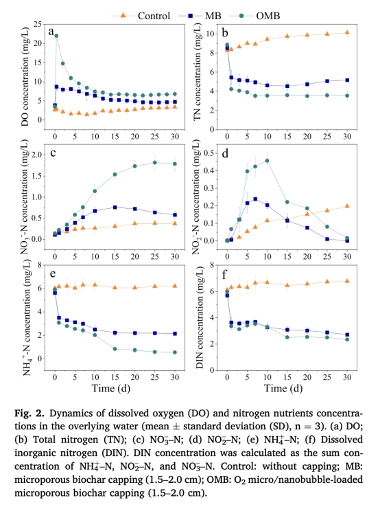 微宇宙實驗:設置對照組(無覆蓋)、MB組(微孔生物炭覆蓋)、OMB組(氧微泡生物炭覆蓋),監測30天內上覆水DO、氮素動態(圖2)及沉積物剖面DO/N?O分布(圖3)。