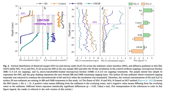 量化缺氧緩解效果:通過微電極直接測量沉積物剖面DO梯度(圖3a),證實OMB將氧滲透深度擴展近10倍(<4.0 mm→38.4 mm),為微生物提供好氧反硝化所需微環境。