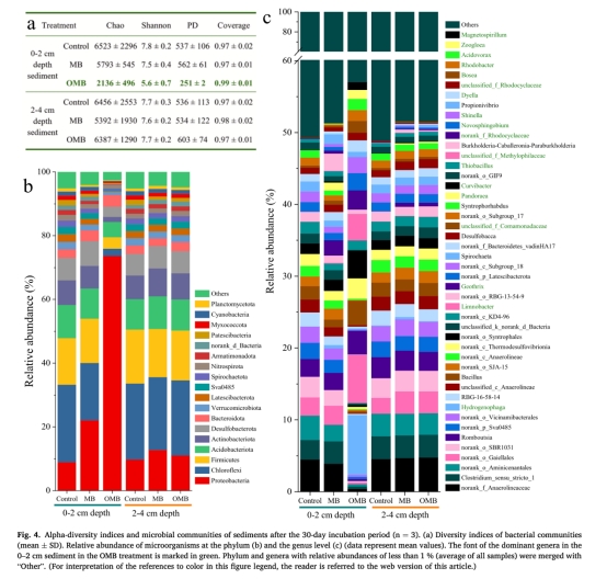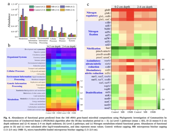微生物響應:分析沉積物微生物群落結構(圖4)、網絡互作(圖5)及功能基因(圖6),明確OMB對好氧反硝化菌的激活機制。