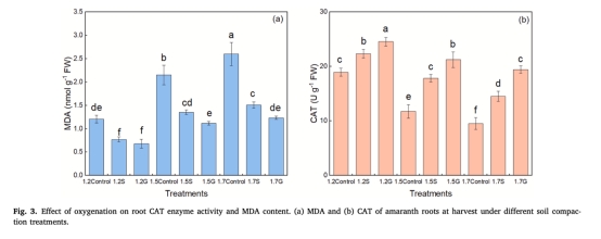 根系響應:增氧促進根系伸長(1.5 g cm?3容重下根長增加76.3%,表2),降低丙二醛(MDA)含量35.8-52.6%,提高過氧化氫酶(CAT)活性13.4-110%(圖3)。