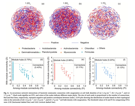微生物群落:增氧增加土壤細菌多樣性(圖5d),富集溶磷菌(Firmicutes和Proteobacteria,圖5a),并在中度板結土壤(1.5 g cm?3)中構建更穩定的微生物共現網絡(圖6,表3)。