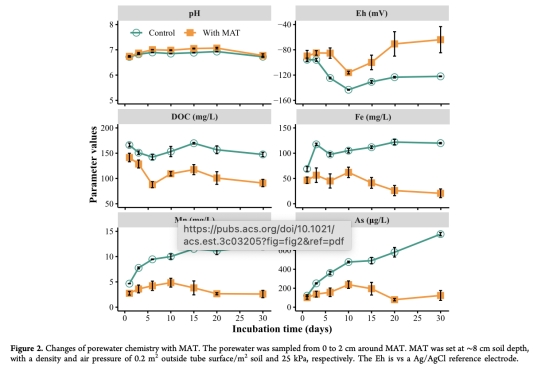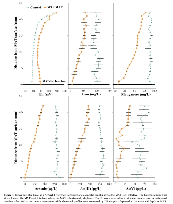 MAT有效性:硅膠管MAT可持續提升土壤Eh(約30%),形成局部氧化區(半徑約5 cm),顯著降低孔隙水砷濃度(降幅>60%)。