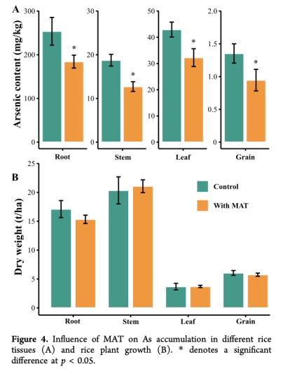 數據:MAT使稻米籽粒砷含量降低30.0%,根、莖、葉砷分別降低27.4%、32.2%、24.9%。
