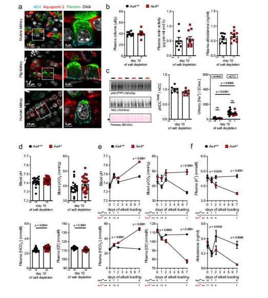 數(shù)據(jù):Ae4?/?小鼠在鹽耗竭后出現(xiàn)低氯性堿中毒(↓血漿[Cl?]、↑血漿[HCO??]);酸負荷后酸中毒更嚴重(↓血pH、↑血漿[Cl?])。