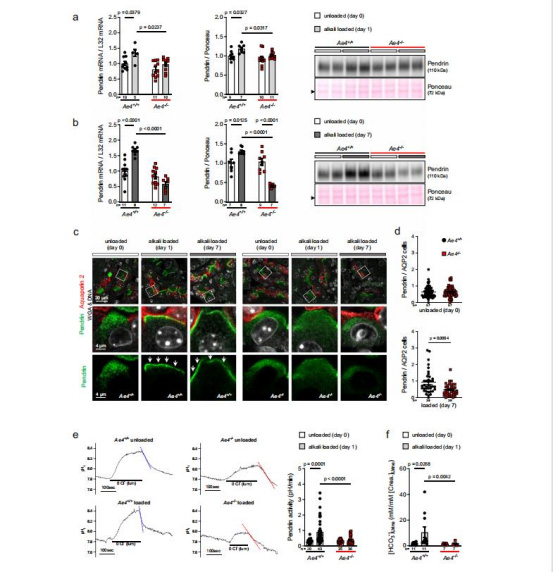 數(shù)據(jù):離體腎小管灌流顯示,堿負荷后野生型pendrin活性↑,尿[HCO??]↑,Ae4?/?無變化。