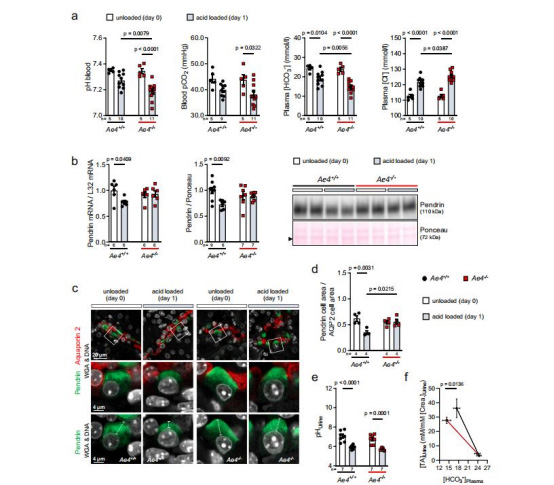 數(shù)據(jù):堿負荷時,野生型pendrin mRNA/蛋白表達↑且膜轉位↑,而Ae4?/?無響應;酸負荷時,野生型pendrin表達↓且膜定位減少,Ae4?/?無變化。