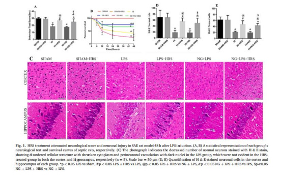 模型構建:幼年SD大鼠腹腔注射LPS(5 mg/kg)誘導SAE,干預組在LPS注射1小時后給予HRS(5 ml/kg)。