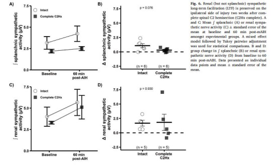 交感神經可塑性差異:完全性C2Hx后,內臟交感神經(splanchnic)sympLTF消失,但腎交感神經(renal)sympLTF保留。