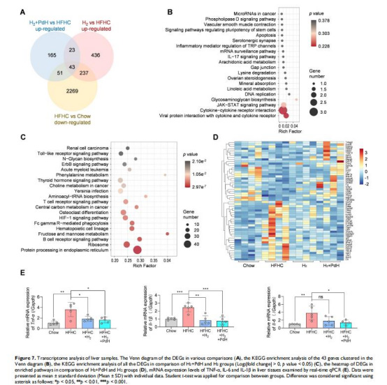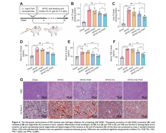 輕度NASH預防:PdH注射 + 每日H?吸入(16周),改善血脂(圖4B-C)、炎癥(圖4D-F)及脂肪變性(圖4G)。