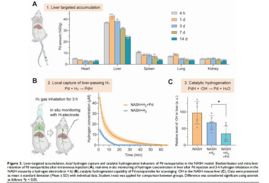 驗證新策略可行性:利用Pd NPs的肝靶向蓄積、H?捕獲存儲及催化·OH氫化能力(·OH + H? → H?O),實現(xiàn)肝部局部高效抗炎。