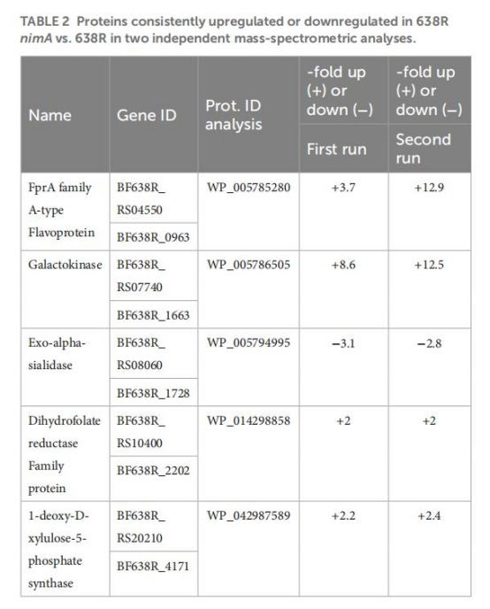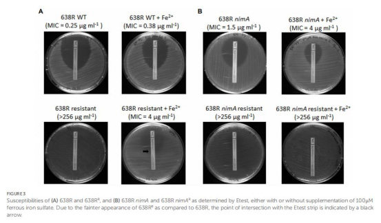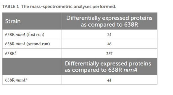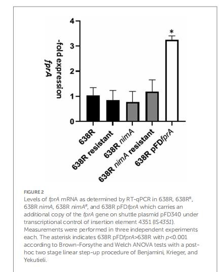 含nimA菌株(638R nimA) 的耐藥性(638R nimAR)僅引起少量蛋白變化,且FprA(黃素鐵氧還蛋白)持續(xù)上調(diào),但過表達(dá)FprA不直接賦予耐藥性。