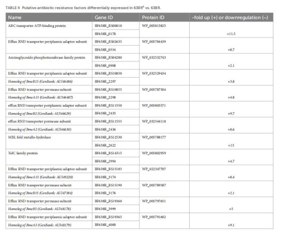 RND外排泵上調(diào)(如BmeAB5: +9.1倍)(表4)→ 藥物外排增強(qiáng)。