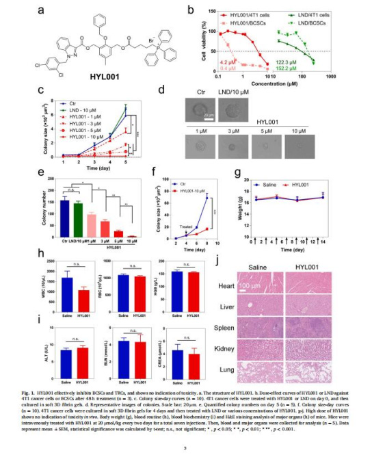 數(shù)據(jù):HYL001對BCSCs的IC??(0.44 μM)比LND低380倍(圖1b);顯著抑制TRCs集落形成(圖1c-e)。