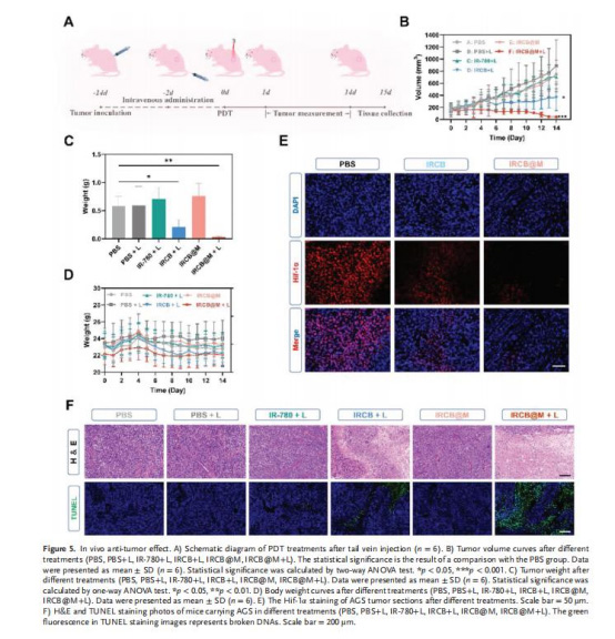 數(shù)據(jù):IRCB@M+激光組腫瘤體積縮小85%,重量減少80%(vs. PBS組)。