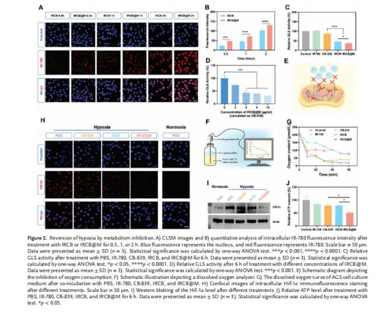 溶解氧電極顯示IRCB@M組氧消耗率降低50%(vs. PBS組)。