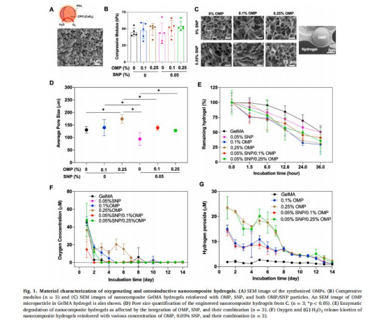本研究開發了一種基于過氧化鈣(CPO)的產氧微顆粒(OMPs),并將其整合到甲基丙烯酰化明膠(GelMA)水凝膠中,用于改善缺氧微環境下人骨髓間充質干細胞(hMSCs)的成骨分化。核心發現包括:
