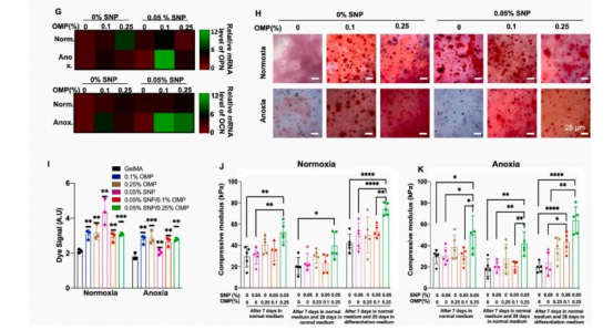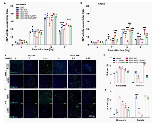 ALP活性(圖3B):缺氧下SNP/OMP組ALP活性比SNP組高3倍。