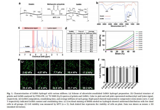 調(diào)控GelMA濃度(10–30%)和紫外交聯(lián)時(shí)間(30–90秒)制備不同剛度水凝膠(圖1a-d)。