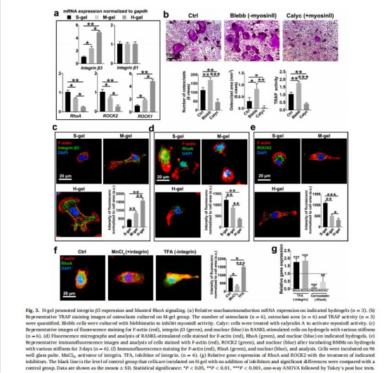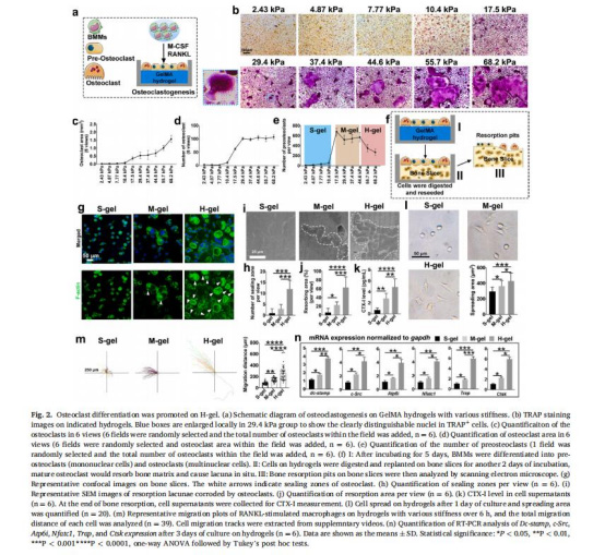 數(shù)據(jù):高剛度組(68.2 kPa)的TRAP?多核破骨細(xì)胞數(shù)量較軟剛度組(2.43 kPa)增加3倍,骨吸收面積增加2.5倍(圖2j)。